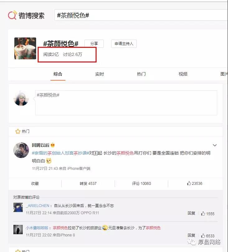 在兩個(gè)網(wǎng)紅茶鼻祖的你來我往中,長沙的#茶顏悅色#殺出了一條血路,截止筆者撰稿時(shí),該話題閱讀2億、討論2.6萬,活躍度并不比昨天就開始的互懟大戲低,其或?qū)⒊蔀樵摯涡率讲栾嬈放频壍淖畲筅A家。