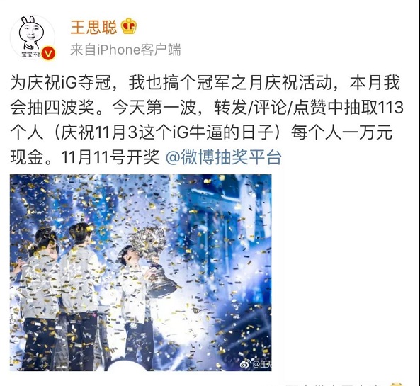 iG奪冠,朋友圈,微博,QQ空間都刷屏了,王思聰一開心就發(fā)了一條微博,截止目前將近2000萬轉(zhuǎn)發(fā),1300多萬評論,氣勢如虹。 這里面最大的贏家是誰?不是王思聰,不是最終中獎的113人,而是微博。