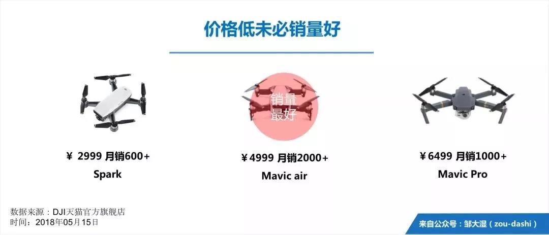 這幾年,小米模式非常熱,很多小米系的低價(jià)產(chǎn)品都賣得很好。但這不代表價(jià)格低,一定就銷量好。比如大疆的自家產(chǎn)品,最便宜的無人機(jī)是Spark (售價(jià)2999),但它卻是大疆無人機(jī)中銷量最差的。