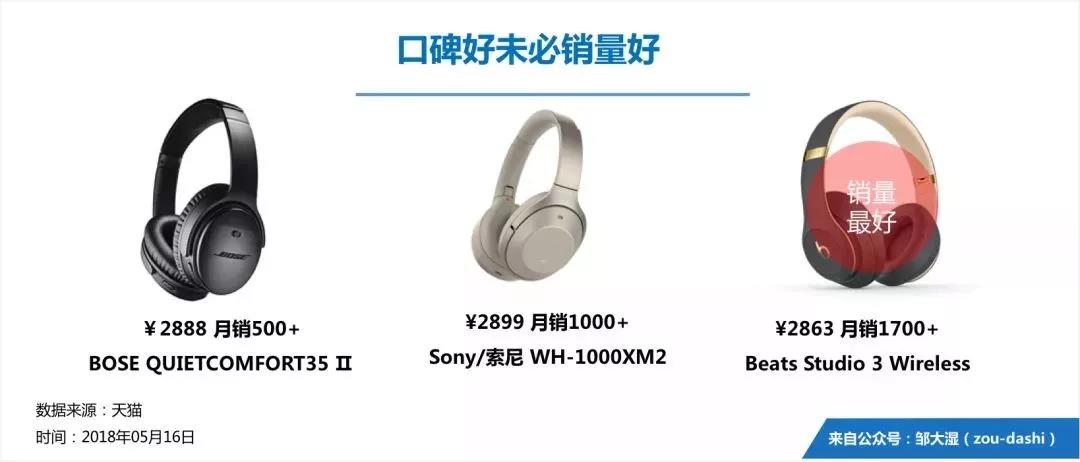 以2800價(jià)位的三款頭戴降噪耳機(jī)為例。無論是天貓購買評分還是大眾口碑,Bose和Sony的產(chǎn)品,都要好過Beats。但Beats就是賣得最好。三款產(chǎn)品價(jià)位一致,論整體音質(zhì)和降噪效果,Beats都遜于Bose和Sony,憑什么賣得最好?因?yàn)锽eats,有讓人購買的理由。