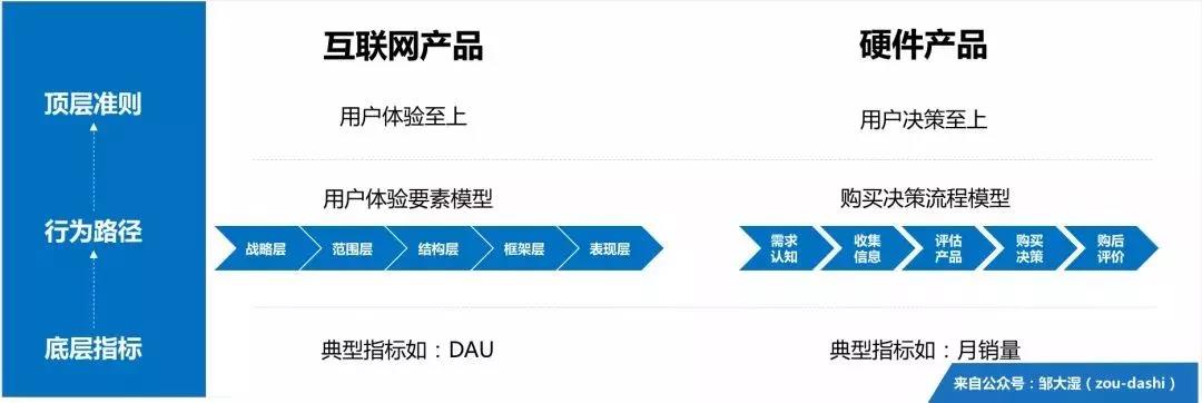 互聯(lián)網(wǎng)產(chǎn)品體驗(yàn)至上,硬件產(chǎn)品決策至上,兩者差異是因?yàn)楫a(chǎn)品成功的指標(biāo)不同以及用戶行為路徑不同。