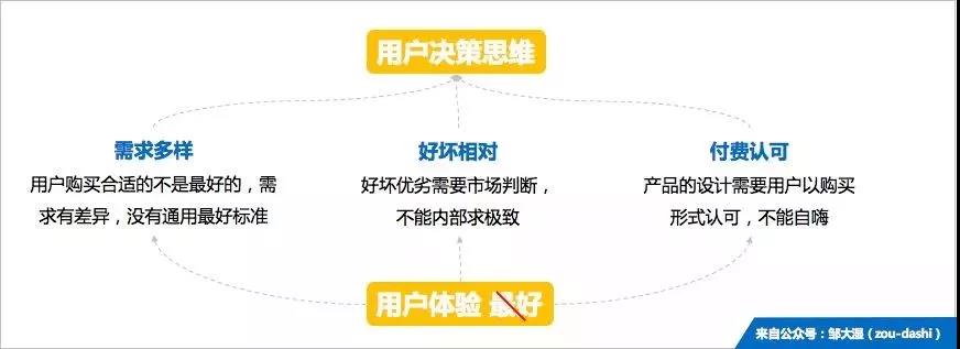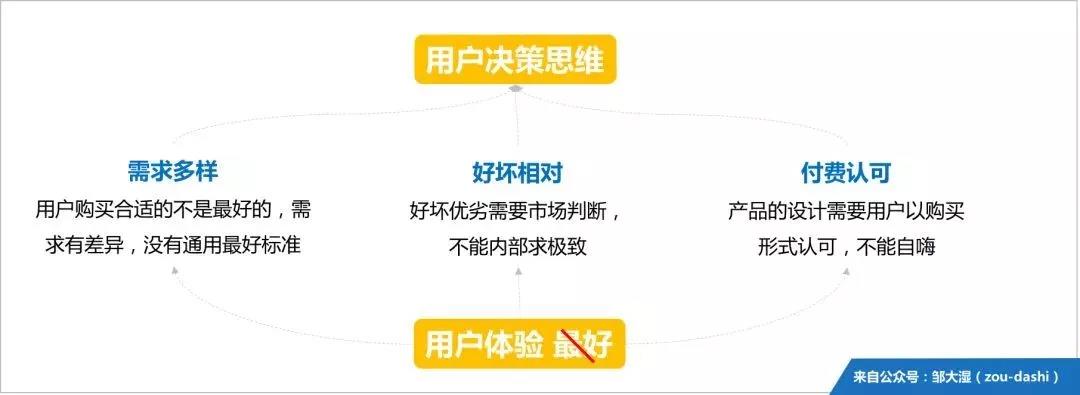 總結(jié)來說,用戶決策思維依然是以用戶為中心。不求單向體驗(yàn)最好,而是綜合需求多樣、好壞相對和付費(fèi)認(rèn)可三個(gè)維度。