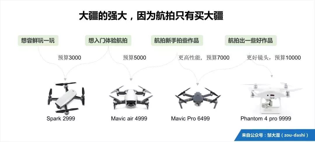 只要你想要買航拍無人機(jī),你的購買決策,就會(huì)掉進(jìn)Spark-Mavic-Phantom三元產(chǎn)品陣營中。從3000價(jià)位到萬元價(jià)位。任何一個(gè)區(qū)段的需求,你除了大疆,都沒有可選。
