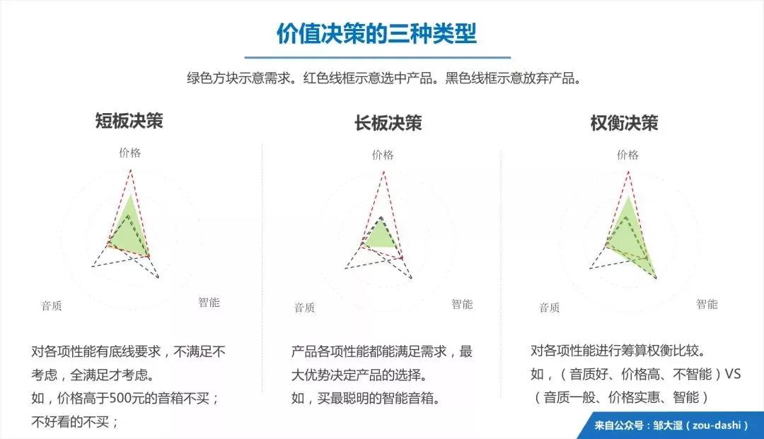 智能音箱的購買選擇,基本來自產(chǎn)品的價(jià)值決策。主要有三條規(guī)則,分別是短板決策、長板決策和權(quán)衡決策。