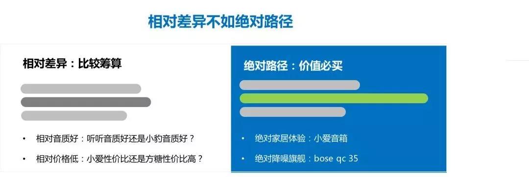 比如智能音箱,騰訊的聽聽的音質(zhì)不錯(cuò),是一個(gè)相比小愛和天貓的相對差異。但聽聽的音質(zhì)是絕對最好的嗎?不是。在聽聽發(fā)售之后,同樣發(fā)售的小豹音箱,也宣傳說音質(zhì)好。用戶很難判斷,兩者究竟哪個(gè)更好。再者,如果未來百度或者天貓聯(lián)合Bose推出一款價(jià)格999的品質(zhì)音箱。千元以內(nèi)的買音質(zhì)最好的決策邏輯,立刻會(huì)被Bose奪走。