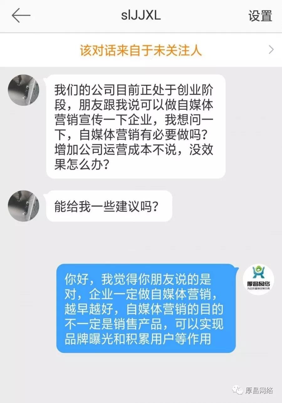 前天,有人在我們厚昌網(wǎng)絡(luò)顧問微博中留言說“我們的公司目前正處于創(chuàng)業(yè)階段,朋友跟我說可以做自媒體營銷宣傳一下企業(yè),我想問一下,自媒體營銷有必要做嗎?增加公司運(yùn)營成本不說,沒效果怎么辦?”