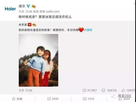比如,2016在唐嫣羅晉公布戀情時(shí),海爾官微借勢發(fā)布微博“啥時(shí)候成親?需要冰箱空調(diào)洗衣機(jī)么”帶動全網(wǎng)企業(yè)官微參與,事件曝光過億。