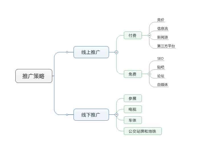 做好市場(chǎng)分析,我們就可以著手開始制定推廣策略。有了以上的準(zhǔn)備工作,你在渠道選擇上會(huì)更有針對(duì)性,如以下思維導(dǎo)圖,我們會(huì)將推廣策略分為線上和線下兩個(gè)部分,我們今天著重介紹一下線上推廣的部分。